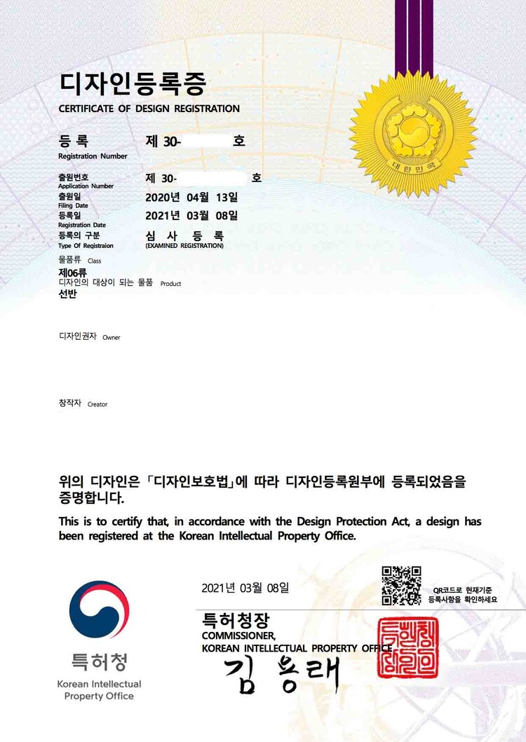 특허청에 공식적으로 디자인등록이 되어있습니다. 유사품에 주의하세요.