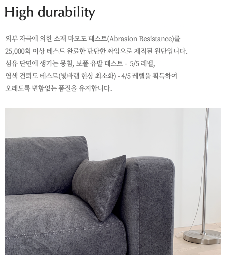시트는 주로 고가의 소파에 사용되는 고퀄리티의 수입원단이며, 발수와 이지클린 기능이 더해져 관리가 용이합니다.